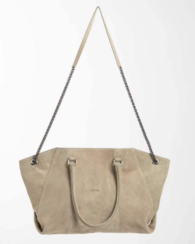 Cartera confeccionada en 100% cuero vacuno. De tamaño grande, estilo shopping bag. presenta cadena para usarla como bandolera o manija para colgarla al hombro.