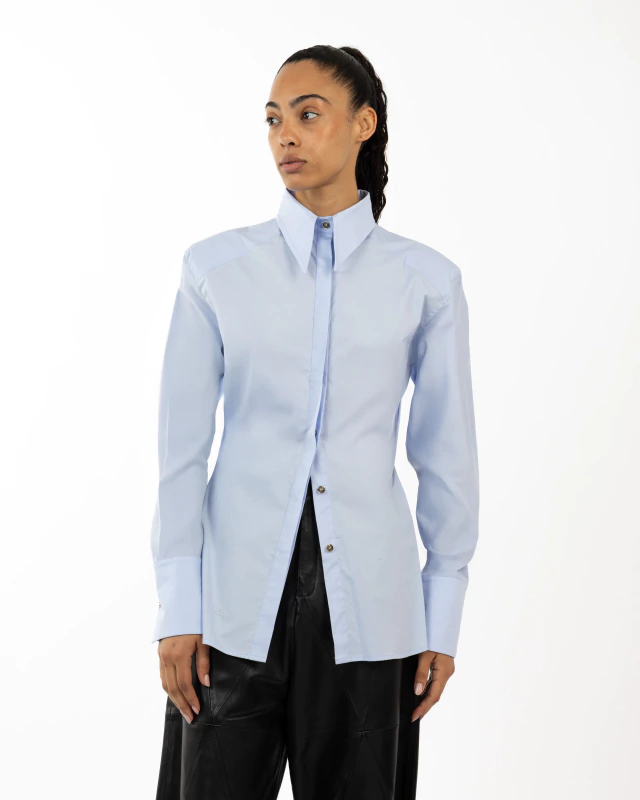 Camisa larga de poplin, corte recto y fit holgado. Cuello clásico, cierre con botones ocultos y puños anchos con botón metálico. Canesú trasero y ruedo curvo.